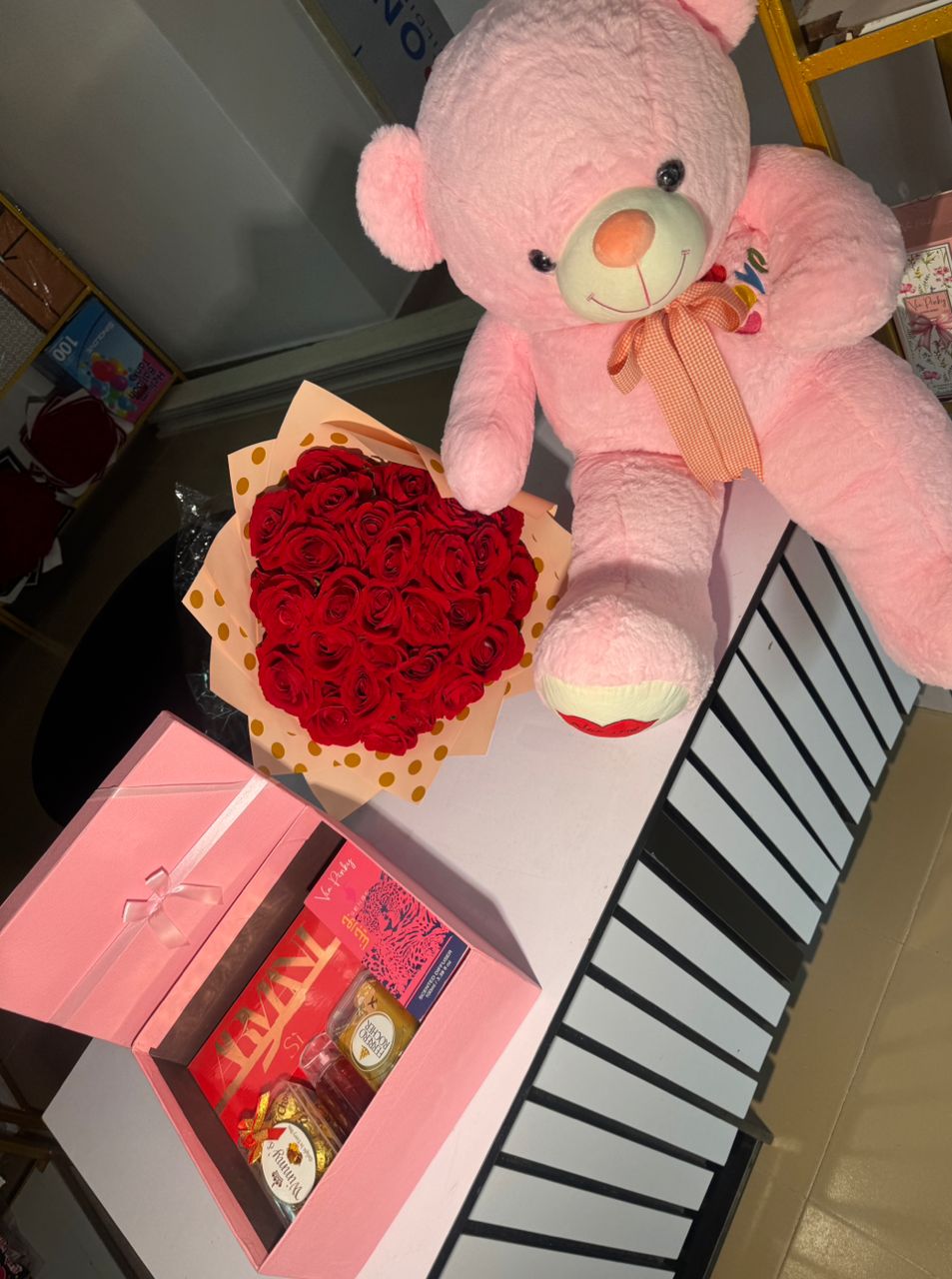 15 fresh roses, chocolates, 100cm teddy, perfume, body mist, room diffuser
