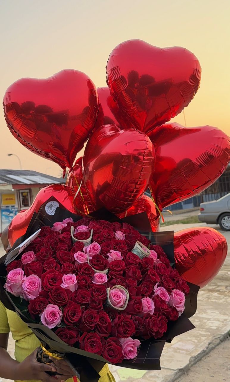 100 fresh roses and 10 heart balloons