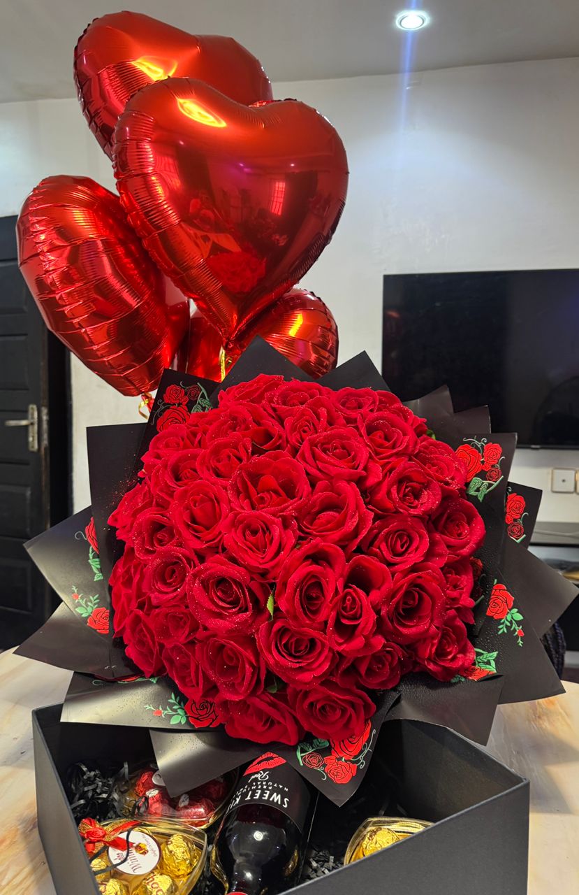4 helium balloon, 50 faux roses, box of wine and chocolates